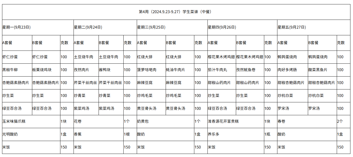 第4周(2024.9.23-9.27)学生菜谱(中餐)