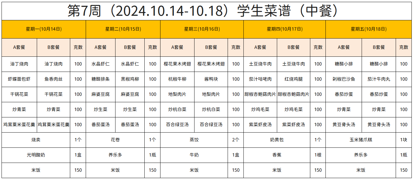 第7周(2024.10.14-10.18)学生菜谱(中餐)
