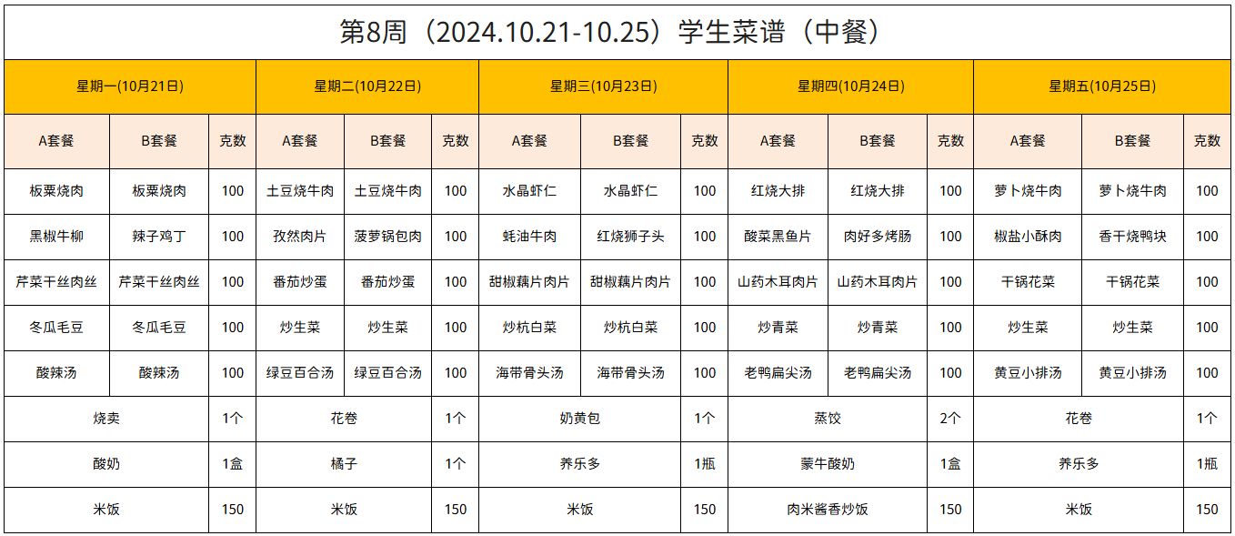 第8周(2024.10.21-10.25)学生菜谱(中餐)