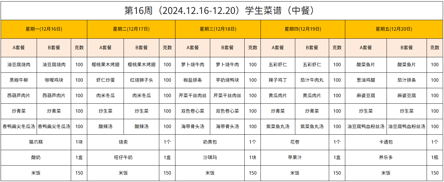 第16周(2024.12.16-12.20)学生菜谱(中餐)