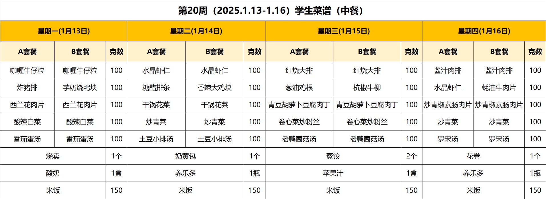 第20周(2025.1.13-1.16)学生菜谱(中餐)
