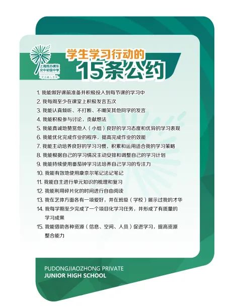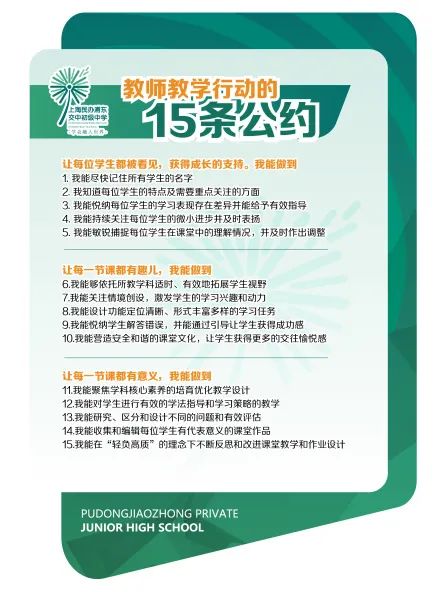 吕校长说,从2020年9月起,通过回顾学校办学历史,在发扬传承的基础上研制十四五发展规划,启动了学校转型发展的创新变革,围绕学校核心工作的“蒲公英三色生命课程建设”(出色课程——兴趣类拓展课、探究课,底色课程——学科类课程,基色课程——健康、学习、生活、社交四方面素养培育课程),系统构建了全面推动学校工作框架的十大行动。对教师和学生分别提出了15条公约。让我印象特别深刻的是,教师要尽快记住所有学生的名字,知道每位学生的特点及需要重点关注的方面,学生要做好课前准备并积极投入到每节课的学习中,每周至少在课堂上发言5次等。