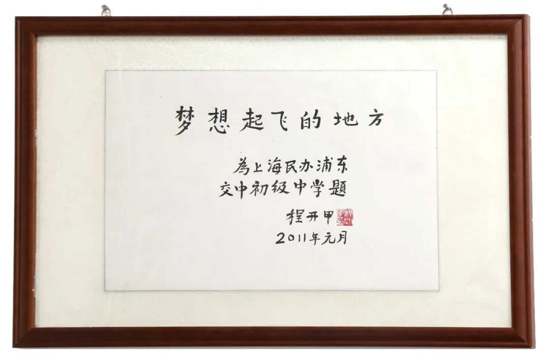“梦想起飞的地方”,这是我国“两弹一星”元勋、“八一勋章”获得者、中科院院士程开甲在2011年元月为我校的题词。一位著名的科学家,多次受到习近平等党和国家领导人授奖接见的院士,为一所办学不到两年的民办初中题词,这在我国教育界是罕见的。程老的题词,是我在其中牵线搭桥,由交大附中58届校友、程老部下的一位干部联系后题写的。这一题词,是老一辈科学家对下一代的关心和期望,是对教育事业的支持,是对我校的肯定和赞誉。程老的热心,极大地鼓舞着全校师生更加勤奋地工作、学习,在追梦的路上不断创造佳绩。