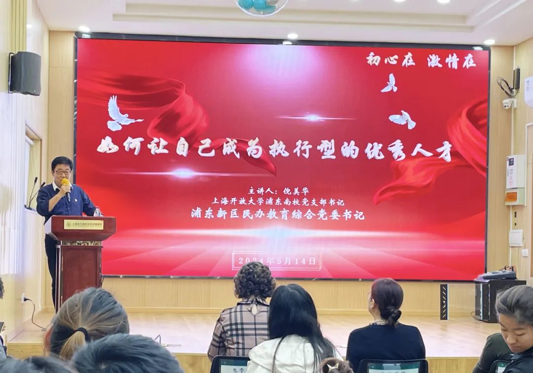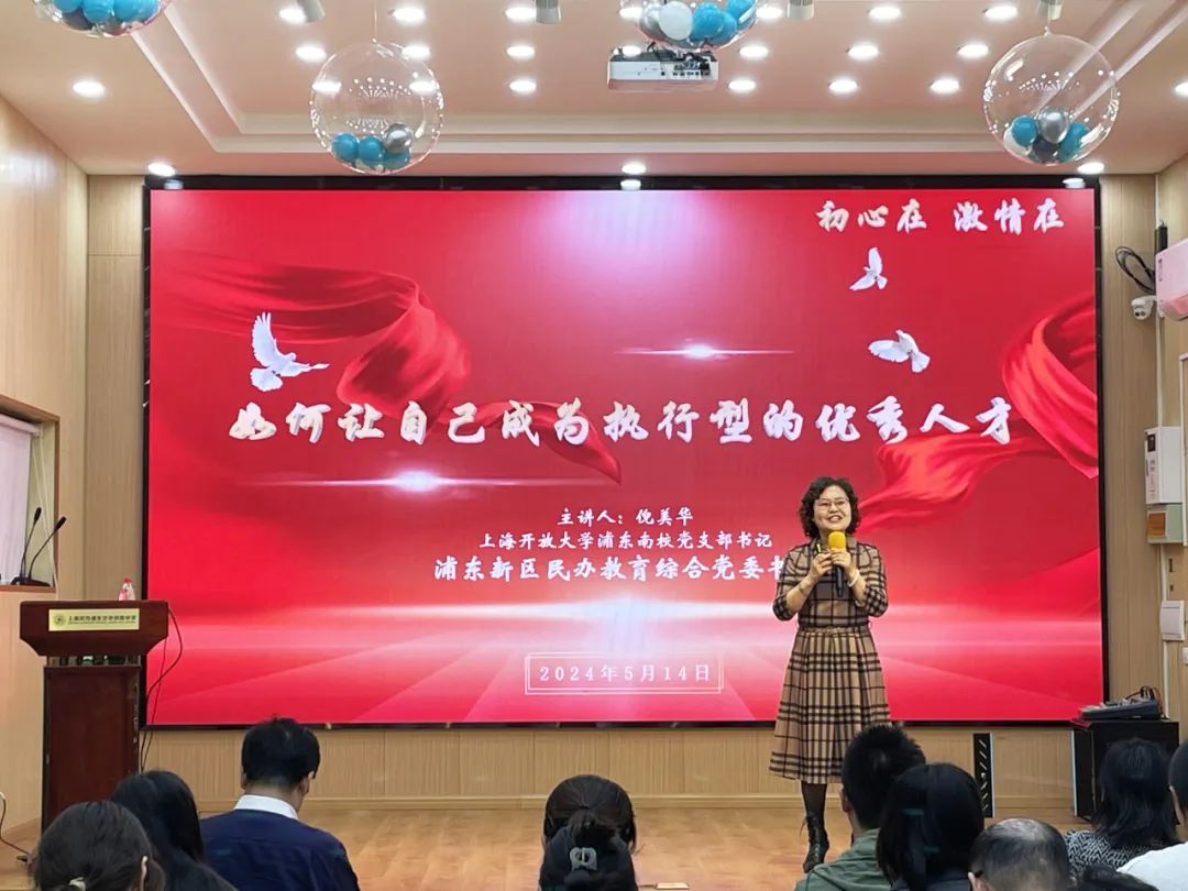 5月14日下午,邀请上海浦东新区民办教育综合党委书记倪美华莅临我校指导《条例》学习等多方面的党建工作,随后,倪书记又以 “如何成为执行型的优秀人才”为主题,给我们上了一堂生动的主题党课,旨在提升党员和教师在实际工作中的执行能力和引领作用。