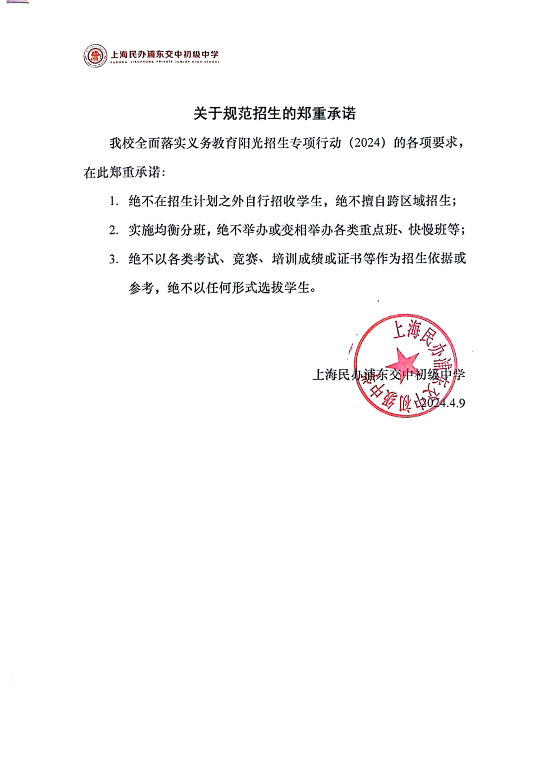 关于规范招生的郑重承诺