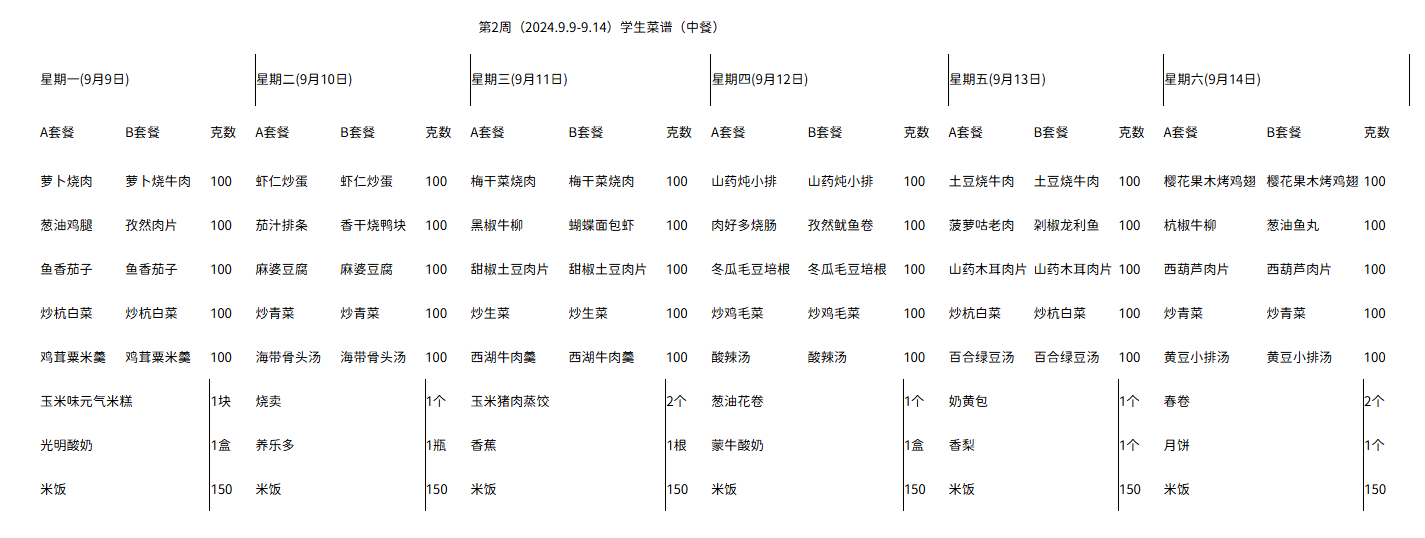 第2周(2024.9.9-9.14)学生菜谱(中餐)