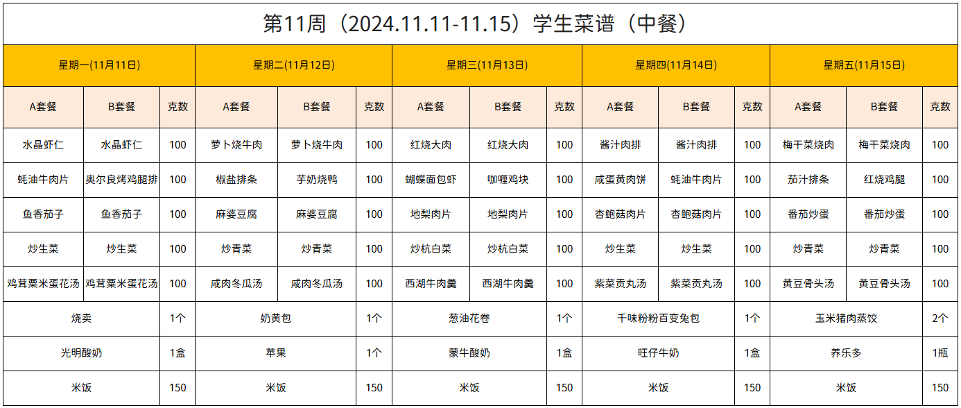 第11周(2024.11.11-11.15)学生菜谱(中餐)